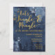 Um convite de férias elegante e elegante foi lançado em belos marinhos azuis, cor d'água, cor azul-d'água, céu nevado sobre uma cena de verdes silenciosos com flocos de neve brancos e dourados com uma fonte viva de caligrafia dourada convidando seus hóspedes para uma noite de jingle e mingle.