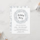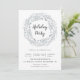 Convite para festas de férias com uma elegante coroa floral e rabo de galinha com bagas brancas. Na parte de trás do cartão há um padrão acentuado. A leveza e as cores dessaturadas simulam um dia de inverno nítido.