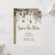 Festa de Natal SNOWY PINES Salve o Convite para a Data - Apresentando uma terra de saltos naturais de pinheiros, cones de pínus, galhos e florais, gotejando com cristais e ornamentos em fundo não branco, este convite apresenta 'Salvar a Data' e outro texto em uma caligrafia moderna, verde-pinha, com o resto do convite em uma bela seringa negra tipografia. A parte de trás do cartão apresenta um galho de árvores de inverno nevado pingando com ornamentos. O convite perfeito para o seu próximo evento, para garantir que os seus convidados tenham o dia livre.