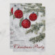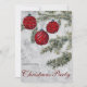 Convide convidados para uma memorável Festa de Natal com este elegante convite de belos ornamentos vermelhos que decoram uma árvore com fundo de inverno. Artesanato original pintado à mão em aquarela.