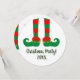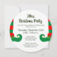 Convites de festas de Natal redondos. Convidados de festas personalizadas para casa, filhos, família, amigos, escritório corporativo, reunião de negócios ou evento de empresa. Cores personalizáveis de texto e fundo. Forma de recorte em círculo com pés de elfo fofos design em cores tradicionais vermelho, branco e verde. Simples modelo para convidar amigos, parceiros, funcionários, colegas, colegas de trabalho, funcionarios, pessoal, voluntários, chefe, gerentes, família. Impressão de modelo de dois lados modernos com tipografia elegante. Pode também ser usado para reuniões de família ou de Natal.