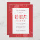 Um convite bonito para festas de férias com um padrão floral em fundo vermelho. Os detalhes da festa são escritos em fontes modernas.