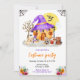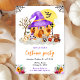 Este convite para festas do Dia das Bruxas, lindo e divertido, apresenta uma casa de abóbora e animais adoráveis em vestido de rico. O texto combina o script manuscrito e as fontes sans serif para uma aparência na moda e moderna. Arranjos de flores e teias de aranha adicionam um toque rústico e assustador. Isto é perfeito para uma festa de fantasia ou truque e tratamento.