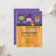 O padrão de estrelas roxas no fundo superior, listras laranja no fundo e um Frankenstein, personagens de bruxas e lobisomens ilustram este convite legal para a festa de Halloween. Diz: "Estás convidado para uma festa de fantasia de Halloween".