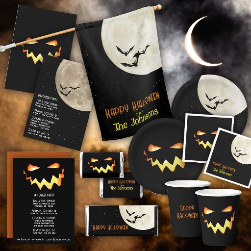 Prepare o humor para a sua festa de Halloween com este convite assustador. Os morcegos loucos são silenciados contra uma lua de cheio num céu noturno estrelado. O uso da tipografia contemporânea dá a esse convite uma vibração moderna. O quê, quem, quando e onde estão todos incluídos juntamente com um ponto para quaisquer detalhes. Personalize com seus próprios detalhes e deixe o partido começar! A parte de trás é preta, com uma face de abóbora brilhando, flutuando no centro