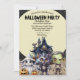 Este convite de festas de fantasia de Halloween fofo e assustador apresenta os pequenos e fofos de desenhos animados mais bonitos. Três adoráveis truques ou tratadores são fotografados em frente a uma casa assombrada de Halloween e uma lua gigante de cheio. Um fantasma de bebê ilustrado, lobisomem, e Frankenstein são impressos em frente à casa assombrada.