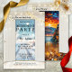 Convite de festa de aposentadoria com imagem de portas se abrindo mostrando uma estrada com flocos de neve cintilantes. O verso mostra um design boho chic com uma cena colorida e festiva de paisagem. Estrelas estilizadas em dourado adicionam um clima de Natal. Lindos para uma aposentadoria no final do ano para celebrar o que foi conquistado e dar boas-vindas a um novo ano com novos começos na vida.