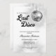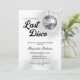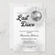 Este convite para festas de solteira mostra um tema de discoteca retrô com uma bola de prata e texto do estilo de 1970. Este convite é perfeito para um fim de semana de despedida de solteira e oferece texto personalizado na parte de trás para o seu itinerário.