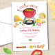 Reúna amigos e família em torno de um pote de fondue para celebrar qualquer ocasião. Um pote de fondue de queijo com efeito de aquarela é rodeado por todos os itens que você pode mergulhar no fondue, incluindo vegetais, camarão e queijos. Uma capa de fondue na parte inferior é carregada com todas as opções de comida e está pronta para mergulhar. O inverso é um plano de água de bolinhas dourada correspondente. Use-o para uma festa de aniversário com tema fondue para crianças ou adultos, um chá de panela, uma festa de noivado, uma festa de aposentadoria, ou qualquer reunião onde você queira ir um pouco atrás. Disponível com produtos correspondentes.