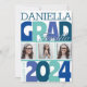 Retro Bold Oversize 3 Photo Blue Teal Formando Convite de festas para segundo grau colorida e moderna e colorida do mais velho ou formando universitário com vibrações hippie! Personalize o texto e adicione seus retratos de mais velho rápida e facilmente. Esses anúncios de graduação exclusivos são o complemento perfeito para todos os convites de formatura amorosos vintage dos anos 60 ou 80!