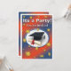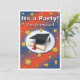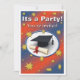 Convite a uma festa de formatura, com fotografia de boné e diploma em fundo texturizado, de azul e vermelho/laranja com estrelas amarelas.