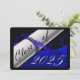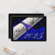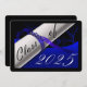 Cartão de graduação azul e preto com diploma e ano de graduação. O fundo é um fundo preto com letras azuis para os convites para festas de formatura.