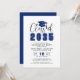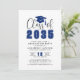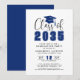 Um convite de festa de formatura elegante e moderno apresentando o ano da turma, como "Turma de 2026", em grande texto azul negrito no topo com um ícone de boina de formatura azul correspondente acima. Abaixo do ano, todos os detalhes do evento são apresentados de forma organizada em fontes limpas e modernas, incluindo o nome do graduado, data de celebração, horário e local, com o número da data destacado em azul para uma aparência coesa.