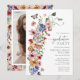 Convite de formatura Boho com flores silvestres. Anuncie sua celebração com este convite marcante que apresenta um buquê lateral gracioso de flores silvestres boho pintadas à mão em azul escuro, rosa brilhante, rosa rosado, amarelo dourado, vermelho vibrante e verde sage, complementado por uma foto de formatura em tamanho real no verso. As cores vibrantes capturam a essência da primavera e do verão enquanto você personaliza a mensagem, as cores e os fundos para criar um convite que realmente fala do coração – deixe sua visão florescer!