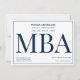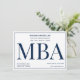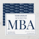 Um convite de festa de formatura MBA em azul e branco. Este convite também tem um padrão da palavra MBA no verso.