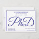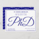 Um convite para festa de formatura de doutorado em azul e branco. Este convite também tem um padrão da palavra PhD, em script, atrás.