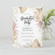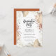 Palma seca da Boêmia Chic e estrutura floral, convite à festa de formatura. A parte traseira da placa apresenta cor laranja sólida de ferrugem no deserto.