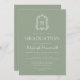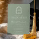 Este design de convite clássico e elegante para festa de formatura de apresenta um monograma branco inicial em letra serif aberta rodeada por uma crista de acanthus de uma crista verde-sábio. Personalize o texto com o nome do formando e os detalhes da parte. A parte traseira da placa é verde estável. Ideal para segundo grau, faculdade ou formando universitário.