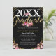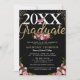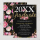 Convites de formatura da turma de 2025 apresentando um fundo preto na moda que pode ser mudado para qualquer cor, lindas flores em aquarela rosa, brilho dourado cintilante, uma borboleta elegante e um modelo de festa de graduados moderno e fácil de personalizar.