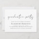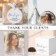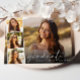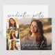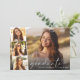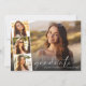 Convite de formatura e festa de graduação elegante e moderno com a foto do formando sobreposta com uma faixa de três fotos quadradas menores, "obrigado" em um script branco fino e chique, e o nome e ano de formatura em tipografia branca simples. No verso, adicione os detalhes da festa de formatura.