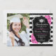 Festa de formatura com sua foto. Possui listras brancas pretas, fonte de script, rosas cor-de-rosa pinceladas, tassel e confetti. Design cor-de-rosa preto elegante com prata brilhante. Perfeito para uma celebração elegante.