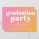 Convite moderno, cor-de-rosa e laranja, com "festa de formatura" numa letra branca de tendência ousada e detalhes do seu partido numa simples tipografia branca moderna. Adicione a escola de formando e o ano de aula nas costas.