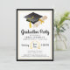 Apresentar uma festa de formatura com um convite com um boné e um gráfico de diploma e um texto com uma legal vibração retroativa. Uma borda preta e dourada arma o design. Este convite funciona bem para licenciaturas em qualquer nível escolar ou universitário. Edite o texto de exemplo com os detalhes de sua parte. Parabéns ao formando!