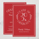 Envie convites de formatura elegantes para a celebração do seu graduado apresentando um emblema de tipografia branco sobre vermelho que diz: GRADUADO DA TURMA DE [ANO] com as palavras curvando-se em torno do ano no meio com folhas botânicas curvas ao longo de cada lado do desenho circular. Abaixo do emblema está o nome do graduado em uma fonte cursiva branca e sua escola em uma fonte serifada elegante. Um retângulo branco fino cria uma borda perto da borda.
