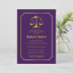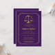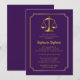 Um design de convite de formatura em roxo e dourado com moldura dourada e balança da justiça que pode ser personalizado para graduações em direito ou outras áreas do campo jurídico. Design composto por Holiday Hearts Designs (direitos reservados).