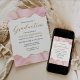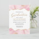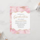 Este convite de festa de formatura de tendência apresenta uma borda superior e inferior do geode de agate de cor d'água em tons de rosa com realces falsos de brilho dourado. A palavra "Graduação" aparece no guião dourado. Personalize o convite com o nome do formando no texto sans serif dourado e os detalhes da parte em cinzas de carvão em fundo branco. Uma imagem cor-de-rosa e dourada correspondente aparece no lado oposto.