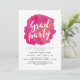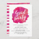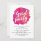Convide amigos e familiares para a sua festa de formando com um convite de festa de formatura cor-de-água rosa. O design apresenta uma cor d'água cor-de-rosa, uma fonte de script na moda, espaços reservados para o seu texto e um padrão de faixa de cor d'água cor-de-rosa no verso.