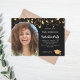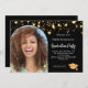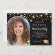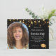 Adicione sua própria foto vertical do formando. Um quadro fotográfico em forma de arco. Uma cor de fundo preto clássica, decorada com estrelas douradas falsas. Personalize e adicione um nome e detalhes da parte.