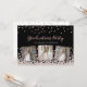 Design de convite de festa de formatura personalizado elegante, com rosa gold e prata confetti sobre um fundo preto, tipografia moderna com as palavras "Festa de formatura", o nome do formando (em prata) e três de suas fotos favoritas emolduradas em folha metálica de ouro rosa. Personalize-o com os detalhes do seu partido no verso do convite.