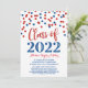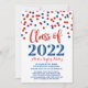 cartão com fotos personalizado de convite para festa de formatura de 2022 em um padrão de confetti vermelho e azul glamoroso e texto moderno com letra manual.