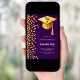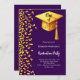 Um convite moderno e elegante para a Festa de formatura. Um fundo roxo decorado com confete dourado falso e um boné de formatura grande com tassel. Personalize e adicione um nome e detalhes da parte. Texto branco.