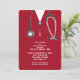 Convites criativos de formatura de escola de enfermagem com scrubs vermelhos de hospital e estetoscópio.