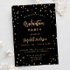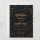 Um cartão de convite glamouroso para uma festa de formatura para ele e para ela. Um fundo preto decorado com estrelas douradas falsas. Personalize e adicione um nome e detalhes da parte. O texto Graduação e o nome são escritos com um script de estilo moderno, escrito à mão. Texto colorido do ouro. Fundo: fundo preto e estrelas ouros.