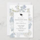 Convite à festa de formatura com uma coroa de flores azuis e verde-aquarela. Personalize com suas informações ou clique em "clique para personalizar mais" para ajustar o tipo de fonte, o tamanho e a cor.