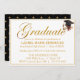 Este simples, mas elegante convite de festa de formatura contém a palavra "Formando" em um roteiro de caligrafia moderna em folha de ouro. No canto superior direito está uma ilustração de um boné de formatura e diploma. Personalize os convites adicionando o nome do formando, o nome do segundo grau ou da faculdade, a classe e os detalhes da festa de formatura com o modelo de fácil utilização fornecido. O verso do convite tem um padrão de estrelas de folha de ouro sobre fundo preto.
