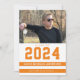 Este convite colorido para festa de formatura de fotos apresenta uma foto horizontal e é acentuado com listras brancas e laranja esportivas. O ano de graduação parece grande acima do nome do formando.