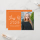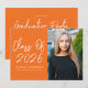 Convites de festa de formatura moderna com "Classe de 2023" em um script manuscrito branco em um fundo laranja. Personalize a parte frontal do convite de formatura, adicionando o nome do formando, o nome da escola e a foto vertical. O convite reverte para exibir os detalhes da sua festa de formatura em letras brancas em um plano de fundo laranja.