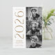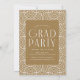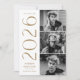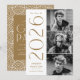 Convites de festa de formatura para 2025 com três fotos do formando localizadas à direita do design em um layout vertical. "2025" é exibido em antigos caracteres dourados/latão, modernos caracteres de deco de arte. Personalize o convite para festa de formatura de fotos moderno, adicionando o nome do formando e o nome da escola. A design reverte para exibir os detalhes da festa de formatura com um fundo geométrico de latão e branco. Perfeito para segundos graus e formandos!
