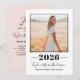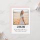 Convite de festa de formatura moderno com uma frente limpa e arrojada com foto, apresentando um ano em negrito e o nome do formando em letra cursiva elegante. O verso é um design rosa harmonioso com um layout simples de detalhes da festa para horário, local e confirmação de presença. Ideal para retratos de formandos, celebrações de casa aberta de formatura e festas organizadas pela família.
