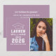 Anuncie seu segundo grau ou formando universitário em estilo com este anúncio de graduação e convite de festas. A placa de dois lados apresenta um retrato mais velho do formando com boné formando e design de tipografia branca simples e moderna. O plano de fundo roxo de lavanda / violeta pode ser alterado para uma cor diferente com o recurso "Personalizar" e, em seguida, Editar / Plano de Fundo para selecionar outra cor.