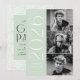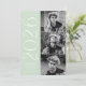 Convites de festa de formatura para 2025 com três fotos do formando localizadas à direita do design em um layout vertical. "2025" é apresentado em letras brancas, modernas de arte, com um fundo verde de menta. Personalize o convite para festa de formatura de fotos moderno, adicionando o nome do formando e o nome da escola. A design reverte para exibir os detalhes da festa de formatura com um fundo geométrico verde e branco da casa da moeda. Perfeito para segundos graus e formandos!