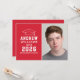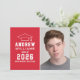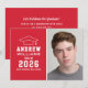 Anuncie seu segundo grau ou formando universitário em estilo com este anúncio de graduação e convite de festas. A placa de dois lados apresenta um retrato mais velho do formando com boné formando e design de tipografia branca simples e moderna. O plano de fundo vermelho pode ser alterado para uma cor diferente com o recurso "Personalizar" e, em seguida, Editar/Fundo para selecionar outra cor.