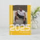 Comemore seu grande dia de formando com nossos convites para festa de formatura de fotos atléticas amarelas modernas. A fonte de cor branca em negrito apresenta o ano da classe, complementando uma foto do formando orgulhoso. Com um processo de personalização simplificado, cada cartão incorpora seu espírito exclusivo de formando, perfeito para atletas de qualquer gênero. Não só a frente do jogo esportivo é uma elegantemente subestimada design, como o inverso também guarda espaço para uma modelo de celebração personalizada. Inevitavelmente na moda, estes convites são o melhor sinal para o seu formando amoroso desportivo.