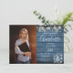 Um convite à festa de formatura rústico com luzes bonito de cordas, frascos-pedras, um nome de estilo de assinatura e tipografia moderna em um fundo azul de madeira rústica, personalizado com sua fotografia de formando e detalhes de celebração. Projetado por Thisnotme©