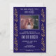 Convite para Festa de formatura de Formando de Folhagem Dourada Elegante. O design tem uma foto personalizada e um texto branco moderno sobre um fundo azul escuro. À esquerda e à direita estão os detalhes da folhagem do ouro. Personalize todos os detalhes na frente e insira sua foto no modelo.
