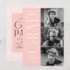 A festa de formatura de tendências convida a apresentar três fotos do formando localizadas à direita do design em um layout vertical. O "Formando" é apresentado em caracteres brancos, modernos de deco artísticos, com um fundo cor-de-rosa pincelado. Personalize o convite para festa de formatura de fotos moderno, adicionando o nome do formando, o ano de graduação e o nome da escola. A design reverte para exibir os detalhes da festa de formatura com um fundo geométrico rochoso e branco. Perfeito para segundos graus e formandos!